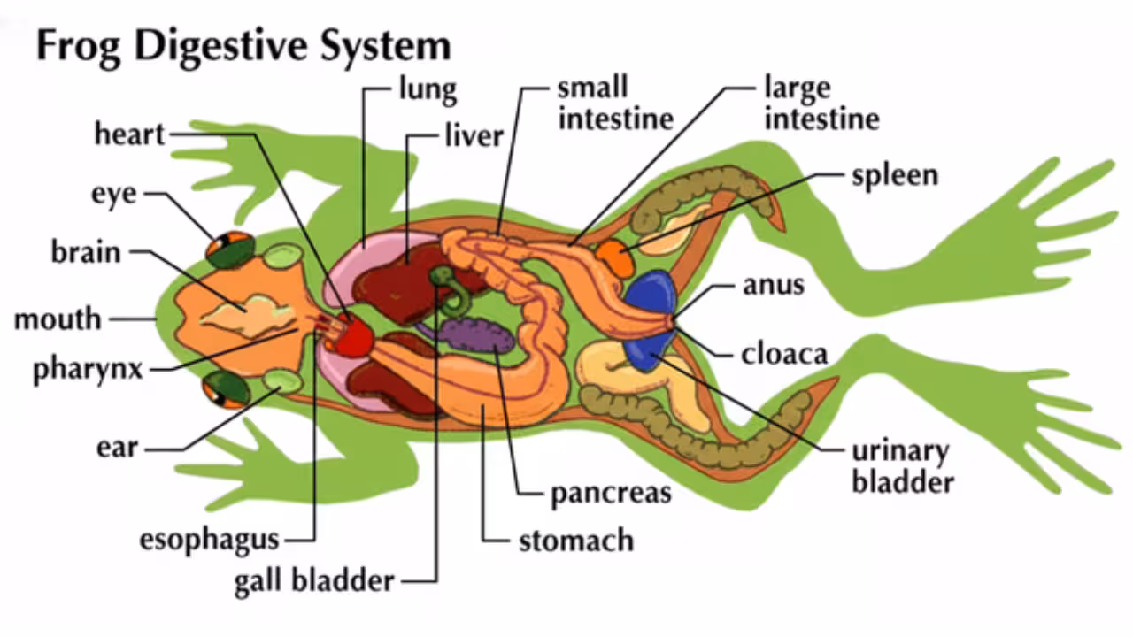 The digestive system of a frog includes all the main organs that help it eat, digest, and absorb food. The main parts are the mouth, buccal cavity, pharynx, oesophagus, stomach, intestine, cloaca, and liver with gall bladder.