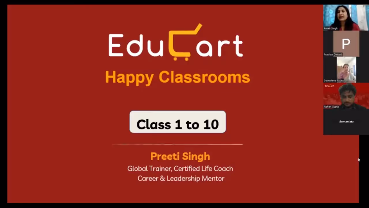 On August 23rd, 2025, Educart, in collaboration with the Principal of RS Public School, Agra - Mrs. Sumanlata conducted an insightful Teachers Training Webinar on “Happy Classrooms.” The two-hour session was led by Global Trainer, Ms. Preeti Singh, and moderated by Rohan.