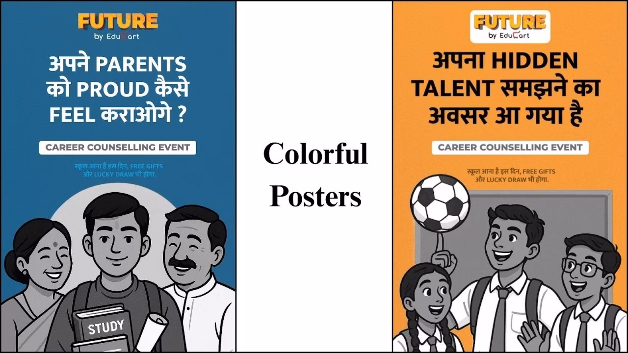 Attractive yet guided colourful posters were put across schools to capture students attention, supported by whatsapp messages from teachers and prominent banners highlighting the programme offerings.