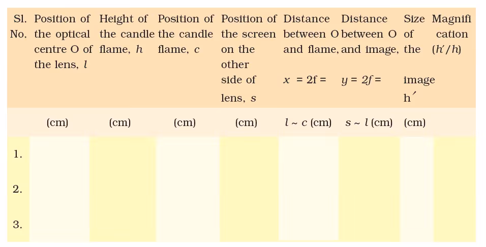 - Repeat the experiment two more times by varying distance x slightly by changing the position of either the thin convex lens or the lighted candle. Locate the sharp image of the flame and record the position and height of the image in each case.