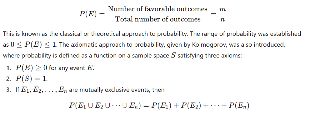In Class 11, probability was defined using the concept of sample space and equally likely outcomes. If an experiment has n equally likely outcomes and an event E has mm favorable outcomes, then the probability of E was defined as: