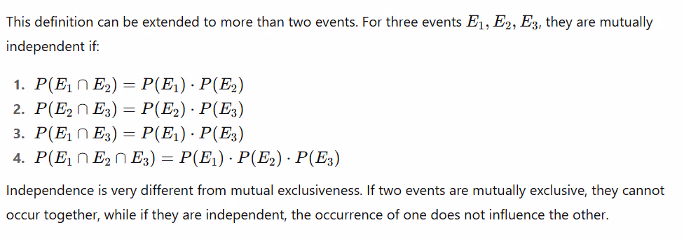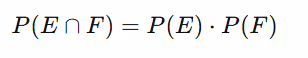 Two events E and F are said to be independent if the occurrence of one does not affect the probability of occurrence of the other. Mathematically, events E and F are independent if: