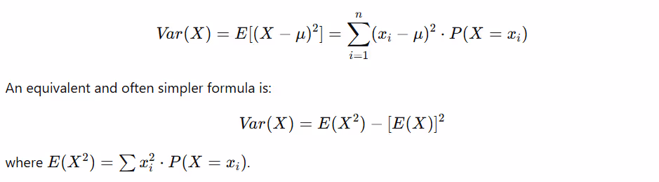 The variance of a random variable measures the spread of its values around the mean. It is defined as: